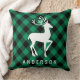 Das quadratische Urlaubskissen verfügt über ein Familienmonogramm Ihres Nachnamens (oder eines anderen Textes) mit einem rustikalen grünen und schwarzen Karo karierten Büffel gemusterter Rahmen und weiße Rentier-Silhouette.