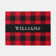 Karomusterfußmatte des roten und schwarzen Büffels dieser Holzfällerart hat einen schwarzen Streifen über der Mitte mit einem Familiennamen im weißen Text. Personifizieren Sie mit Ihrem eigenen Namen oder als Geschenk zu geben.