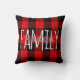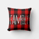 Kariertes Kissen des rustikalen Holzfällers perfekt für den Landdekor mit Monogramm in der Mitte mit dem Familiennamen im Grau bedeckt auf rustikaler Artbeschriftung, die "FAMILIE" liest. Rustikaler, preppy Musterhintergrund der Karos des roten und schwarzen Büffels karierter. Identisch auf beiden Seiten. Cozy Gingham-Wohngestaltung für eine rustikale Klotzkabine. Nettes Housewarminggeschenk.