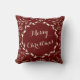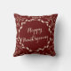 Ein handgezeichneter Kranz von Cindy Bendel umkreist den Text Frohe Weihnachten. Das Kranz ist von botanischem Blattwerk aus Blätter und Ästen umgeben. Die Hintergrundfarbe ist tiefrot. Auf der anderen Seite steht Happy Thanksgiving, Sie können jede Seite mit Ihrem eigenen Text personalisieren. Diese Kissen mit Akzent in Wohngestaltung sind ideal für ein rustikales Thema. © Cindy Bendel Creative Design LLC Alle Rechte vorbehalten