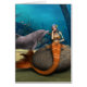 3D digitale Darstellung einer schönen traurigen Meerjungfrau sitzend auf einem Stein und einem niedlichen Delphin auf blauem Fantasy-Hintergrund