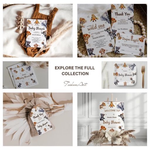 Safari Animal Baby Shower lädt zu einem zauberhaften Ensemble mit charmanten Aquarellbildern verschiedener Dschungeltiere ein: Giraffen, Elefanten, Löwen, Tiger, Strauß, Zebra und Affen, die alle in sanften und lebendigen Aquarelltönen dargestellt sind. Jedes Tier bringt eine Touch von Launen und Verspieltheit in die Feier und ist damit perfekt für eine Babydusche zum Dschungel.