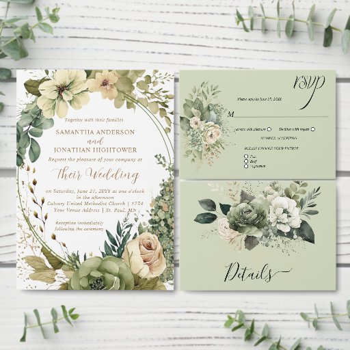 This wedding invitation features a soft, romantic botanical design with a graceful circular greenery frame that gently draws the eye to the center. Delicate watercolor florals in muted sage, ivory, and blush tones surround the layout, creating a natural, garden-inspired aesthetic with a timeless feel. Elegant typography pairs classic serif lettering with flowing script accents, adding a refined and sophisticated touch. Perfect for garden, rustic, or nature-inspired weddings, this invitation offers a beautiful balance of softness and structure, making it an ideal choice for couples seeking understated elegance with a fresh, organic look.