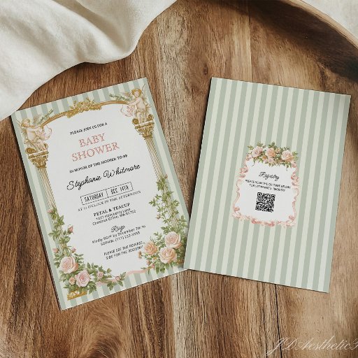 This vintage cherub bridal shower invitation brings a romantic heirloom charm to your celebration with its soft sage stripes, ornate gold columns, and classical cherubs that feel beautifully nostalgic. The blush roses and gentle detailing create a refined garden inspired atmosphere that pairs effortlessly with elegant or timeless bridal themes. Personalizing the wording is simple and the artwork gives every guest a sense of entering a cherished and meaningful gathering. This design also coordinates seamlessly with matching pieces in the suite so your entire event looks cohesive, graceful, and thoughtfully styled.