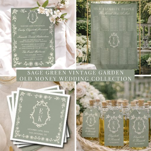Add a refined finishing touch to your wedding reception with these elegant sage green monogram wedding napkins, designed for couples who love timeless, heritage-inspired wedding décor. Featuring a delicate botanical floral border and a sophisticated custom monogram crest, these napkins capture the beauty of the Old Money aesthetic, quiet luxury style, and classic estate wedding elegance.