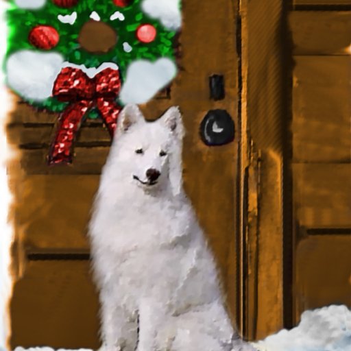 Schöne Samoyed Ferienkunst. Die Samoyed wartet auf der schneebedeckten Veranda, bis der Weihnachtsmann ankommt, um die Kekse des Weihnachtsmanns zu schützen. Wunderbare Weihnachtsgeschenke, Weihnachtskarten, Porto, Kleidung und vieles mehr.