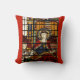 Ein schönes Kissen mit Buntglasfenster von St. Cecilia - dem Schutzpatron der Musik, mit Pfeifenorgel und Kirub/Kinderharfe auf rotem Hintergrund