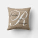 Elegantes Monogramm und Namen-kundenspezifisches Hochzeits-Kissen. Entwurf durch Elke Clarke ©2011. TAN, Schwarzweiss-Skript-Schriftart. Ein einfacher, klassischer Entwurf, aber extrem elegant und vielseitig. Groß, wie ein Hochzeitsgeschenk für Polterabende, Verlobungs-Partys, die Daten, die Paarduschen und die Hochzeitsjahrestagsfeiern retten. Fertigen Sie mit Ihren Informations- und Hochzeitsfarben unter Verwendung Zazzle Aufforderungen besonders an. SEIN SO EINFACHES. Fügen Sie ein Hochzeits-Foto oder Ihr Verlobungs-Foto einer Seite hinzu. Verwenden Sie "besonders anfertigen es" Menü, um den Abstand und die Größe zu ändern, um Ihre Namen und Initialen zu passen. Es druckt, wie Sie es auf Schirm sehen. Nehmen Sie so Ihre Änderungen vor, bevor Sie bestellen.