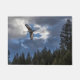 Ein schöner Sandhill Kran im Flug über den Bäumen.