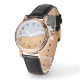 Eine Armbanduhr mit einem Foto eines goldbraunen Sandstrandes mit weißer, schäumender Brandung.