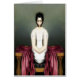 Ein gruseliges Mädchen mit kurzem, dunklem Haar, großen Buggyen Augen und ohne Mund, ihre Arme erscheinen als Zwangsjacke. In einem grünen Saal in einem Sanarium sitzend, wird eine rote Satindecke um ihren leglatten Torso gezogen. Original digitale Kunst von Taylor Addams.
