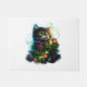 Santa Black Cat hallte in Weihnachtsbaumlicht auf Fußmatte