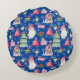 Santa Gnome für Ferien Muster blauer Hintergrund Rundkissen. Ein blaues Hintergrundmuster mit Gnomen, Geschenken, Heiligen, Bonbons, Weihnachtsbäumen und der Tasche des Weihnachtsmanns. Personalisieren Sie dies, um Ihr eigenes Bild zu kacheln.