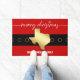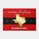 A big belly requires a big belt and a big - that is, Texas-sized - buckle to hold it all together. This somewhat abstract design shows the red of Santa's coat and black belt with gold holes. The buckle is a dimensional gold shape of Texas. Handwritten script across the top wishes the recipient a merry Christmas with your family name below the belt. Put a family photo and the names of your family members on the back.