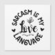 A playful and humorous circular typography design featuring the phrase, "Sarcasm Is My Love Language." The word "Love" is in a central, flowing script with small decorative hearts and a leaf motif, while the surrounding text is in a clear, bold, all-caps font. This design is perfect for those who express affection and humor through sarcasm.