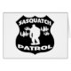 Großes schwarzes Polizei-Abzeichenemblem mit, "Sasquatch Patrouille," geschrieben in einfachen weißen Schriftart mit einer weißen Sasquatch Silhouette in der Mitte und in einem Baumhintergrund der weißen Kiefer.