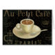 © Daphne Brissonnet/wildes Apple. Eine heiße Schale Cappuccino mit einem Saucer und einem Teelöffel. Der schwarze Hintergrund hat die französischen Wörter, die auf ihn geschrieben werden.