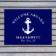 Eine schicke, moderne nautische Tür für Ihr Boot, die eine weiße Abbildung eines Ankeres auf marinebasischem Hintergrund zeigt. Sie können den Text "Welcome Abard" und den Namen und die Lage Ihres Bootes in eleganter weißer Typografie personalisieren.