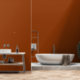Eine schlichte und schlichte Eichhörnchenbraun-Wohngestaltung, die in die Natur eindringt.