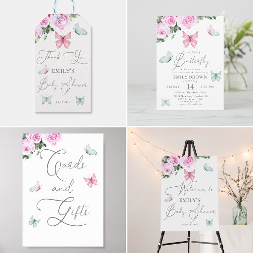 Butterfly on the Way ist eine schön gestaltete Einladungskarte mit einem Aquarellbild aus rosa Rosen und rosa und minzfarbenen Schmetterlingen. Die Karte ist ideal, um die Gäste zur Feier der bevorstehenden Ankunft eines neuen kleinen Mädchens einzuladen.