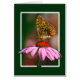 Diese Karte zeigt das Bild eines goldenen Schmetterlings über einer lila Blumenblüte.