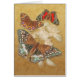 Hübscher goldfarbener Hintergrund mit Blumenmuster und Trio aus Schmetterlingen über Blume. Passen Sie den Text an.