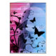 Dieses Ausrüstungsbeschreibungs-Silhouetten der Schmetterlinge und der Blumen auf einem blauen und rosa abstrakten Hintergrund.