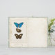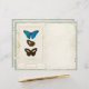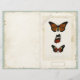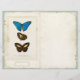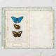 Vintage Junk Journal Seite mit blauen und braunen Schmetterlingswissenschaftlichen Illustrationen auf der Vorderseite und braune Schmetterlingsbilder auf der Rückseite. Französische Zeichnungen und Anmerkungen. Aquamarine Paisley-Hintergrund- und Perchment-Seiten mit Goldetiketten, Klebeband und Heftdetails in der Mitte. Falten Sie in der Mitte, um Journalseiten zu erstellen.
