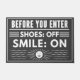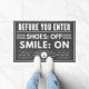 Schnappt ab, lächelt an! Diese Tür verbindet Funktionalität mit Stil: eine klare Botschaft für saubere Böden, verpackt in einem modernen Design mit einer Touch Spaß. Der minimalistische Stil des Schriftartes wird durch eine angenehme Sonne ergänzt, die Wärme und Gemütlichkeit verleiht. Ideal für jeden Einstieg und individuell auf Ihre Zuhause abgestimmt, wird diese Matte Sie und Ihre Gäste aufgeräumt und in guter Laune behalten - oder als Geschenk für Freunde und Familien.