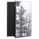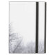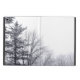 Im horizontalen Schwarzweiss-Foto der Schnee-bedeckten Bäume, übersehen zwei Evergreens auf dem links Rand des Rahmens einige kurzere unfruchtbare Laubbäume, ganz bedeckt mit Schnee. Der Himmel über ihnen ist weiß.