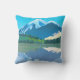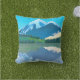 Kissen in einem digitalen Bild von schneebedeckten Bergen und Kiefernwäldern, reflektiert in einem See, unter einem tiefen blauen Himmel