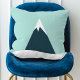 Einfaches, stilvolles Schneebergkissen mit einer angesagten grafischen Darstellung eines Berges in marineblau, einem weißen schneebedeckten Gipfel und einem hellblauen Himmelshintergrund in einem minimalistischen skandinavischen Design-Stil.