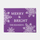 Feierliche Urlaubstüre mit fröhlicher und heller Typografie, weißem Schneeflocken auf lila Hintergrund. Personalisieren mit Familiennamen.