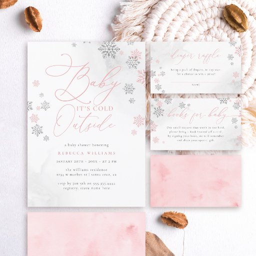 Genießen Sie die Saison mit unserer Baby-Dusche-Einladung, die mit zarten rosa und Imitate verziert ist, silberne Glitzer-Schneeflocken. Die Botschaft "Baby, It's Cold Outside" wird elegant in Kalligraphie und Serifentypografie präsentiert.