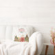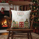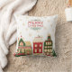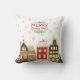 Ein festliches Kissen eines malerischen Viktorianischen Dorfes, seine charmanten Häuser in festlicher Urlaubsatmosphäre, jedes Fenster strahlt ein warmes, einladendes Glühen aus, mit goldenen Schneeflocken, die im Hintergrund fallen, und der Text - Frohe Weihnachten - oben.