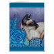 Original Aquarellmalerei von Sandra Gale, mit einem Schokoladenpoint Siamesen Katze, umgeben von blauen Blumen auf einem hellen lila Hintergrund. Blume sind blaue Hydrangea, blaue Mohn und eine blaue Rose. Das Design ist perfekt für Katzenliebhaber und diejenigen, die die siamesische Rasse besonders mögen. Ideal für Schlafzimmerwandkunst oder gerahmt mit passendem Bild. Auch eine passende Aquarellmalerei mit einem blauen Punkt Siam ist verfügbar.