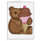 Ein entzückender Teddybär, der sich hinsitzt und seiner riesigen Eistüte mit einer Schaufel der SchokoladenEiscreme und einer Schaufel der Erdbeere anhaftet.
