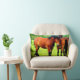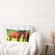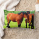 Ein Kopfkissen aus Lendenwirbel zum Thema Horsey. Ein Foto von einem schönen Paar stockender Arbeitspferde. Diese polierten, roten Pferde sind in tiefer Bucht gehalten, mit schwarzen Mäusen und Beinen. Set vor einem üppig grünen Hintergrund von Bäumen und Gräsern.