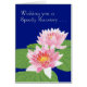 Eine hübsche Get Well Grußkarte mit zwei rosa Wasserlilien und Lilypaden auf tiefblauem Hintergrund, von einem handbemalten Aquarellbild von Judy Adamson. Sie können die innere Nachricht dieser Karte personalisieren, wenn Sie möchten.