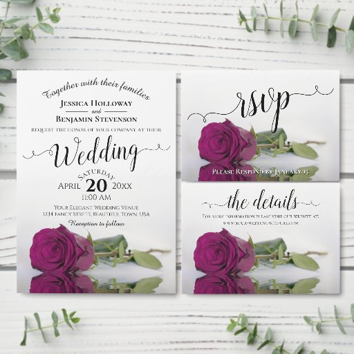 Diese schöne RSVP-Karte zeichnet sich durch ein schlichtes und dennoch elegantes Design aus, mit einem Single, der lange gesteppt ist, lila, magenta oder beerfarbene Rose, die in einem Wasserbecken mit Wellengang reflektiert. Der Titel ist in laky-Script-Kalligraphie geschrieben und es gibt Platz für Ihre Gäste, um die Gesamtzahl der Teilnehmer und ihre Wahl des Essens anzugeben.