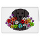 Schöner schwarzer Labrador-Illustrationsentwurf für Hundeliebhaber, die Liebe Labrador-Retriever verfolgt. Bunte und schöne Blumen blühen um den Hund. Schwarzer Labrador-Hundedigitales Zeichnen geschaffen von Naomi Ochiai von Japan. Sie können Text addieren.