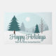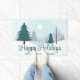 Eine wunderschöne Winterlandschaft mit aquamarinen grünen Pinienbäumen und schneebedecktem Boden auf einer personalisierten Urlaubsmatte. Passen Sie die Happy Holidays Dekoration mit Ihrem eigenen Firmennamen an.