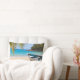 Ein Kissen mit Lumbalbahn und eine idyllische tropische Strandlandschaft. Türkisblaues kristallklares Wasser und ein sanfter brauner Sandstrand. Einige Blätter aus Palmen hängen von oben herab. Ein altes Holzboot sitzt am Strand. Eine ruhige und friedliche Landschaft.