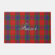 Willkommene Matte der eleganten und interessanten Tür, die den wunderbaren schottischen Clan Fraser Tartan kariert, mit individuellem Namen kennzeichnet.