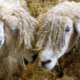 Zwei schöne Cotswold Schafe fotografierten in einem lustigen und humorvollen Moment, in dem sie miteinander sprachen. Cotswold Schafe stammen aus den Cotswolds in England und werden für ihre Wolle und Fleisch gezüchtet. Sie haben lange Fleecen mit fast goldener Note.