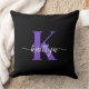 Dieses schlichte, elegante, schwarze 20-Zoll-Kissen mit Ihrem Vornamen in einem trendigen Script-Schriftart in Weiß und Ihre erste Initiale in einem modernen lila Cap-Schriftart ist perfekt für Sie. Es ist stilvoll und trendig und dennoch sehr klassisch. Es wird fantastisch aussehen in Ihrem Schlafzimmer, Wohnzimmer, Aussichtsterrasse, sie vergossen.