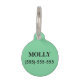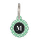 Dieses Begleitertag hat einen schwarzen Kreis in der Mitte mit einem personalisierbaren Monogramm-Buchstaben. Die Hintergrundfarbe ist minzgrün mit weißem Hundegeflecht. Auf der anderen Seite gibt es personalisierbare Textbereiche für den Namen Ihres Tieres und für Ihre Telefonnummer.