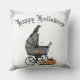 Dieses in schwarzer Tinte handgezeichnet, festliche "Happy Halloween" Kissen zeigt handgezeichnet Illustrationen in schwarzer Tinte von Nathalie Portet eines antiken Viktorianischen Babywagens, schwarzer Krähe, Kürbisse und Spinnweben, die alle auf einem klassisch weißen Hintergrund stehen. Mit bearbeitbarem Text passen Sie Ihr Kissen auf der Produktseite an, indem Sie auf "Diese Vorlage personalisieren" klicken, bevor Sie sie in Ihren Warenkorb aufnehmen.