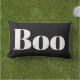 Set von Ihrem Innenhof oder Veranda mit diesem schwarz-weiß Halloween Boo Typografie Lumbar Kissen. Es ist mit einem schwarzen Hintergrund und das Wort "boo" in fett weißer, grobkörniger, einfacher Schrift entworfen.