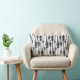 Ein schwarz-weißes Kissen mit einem Muster von schwarzen, östlichen Pinienbäumen in einem Wald.